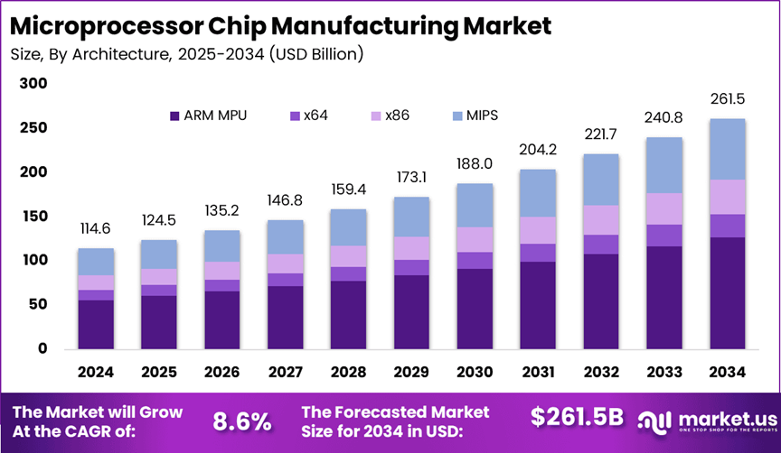 市场驱动力来自对高性能计算日益增长的需求、互联设备的日益普及以及云基础设施的扩展。人工智能、机器学习和高级数据分析的发展需要强大的处理器,从而推动了微处理器设计的创新。随着电动汽车和自动驾驶的兴起,汽车行业对专用芯片的需求也显著增加。